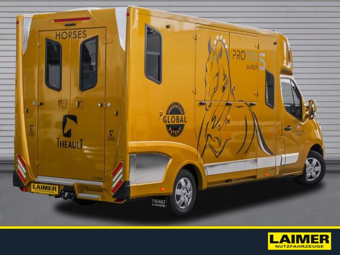 | Aufbau Details: | Basisfahrzeug Renault Master Grand Confort, "Proteo Switch" - Schiebbare Alupferdetrennwand, Lautsprecher für Pferdebereich, Boden Soft-Gummi, Temperaturanzeige für Pferdebereich, Hecktüre in zwei Lateralteilen mit Fenstern, Prädisposition Sattelschrank an der Hecktüre |